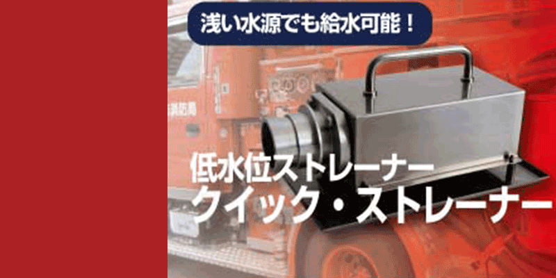 低水位ストレーナー 「クイック・ストレーナー®」は、自然水利はもちろん水深の浅い水源でも4cm以上あれば吸水が可能な低水位対応吸水装置です。